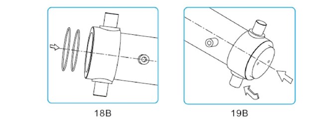 將導(dǎo)向帶置于缸筒尾部活塞槽內(nèi),加上足夠的潤滑油。將缸筒進(jìn)一步推入外缸筒直到導(dǎo)向帶完全處于外缸筒中。