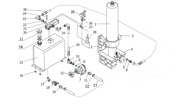 請(qǐng)按照上圖用油管和氣管將全部液壓元件連接進(jìn)來(lái)。確保油管(軟管)長(zhǎng)度足夠長(zhǎng),以免在舉升過(guò)程妨礙油缸的運(yùn)動(dòng)。組裝完成后沒有必要立即將氣體從油缸中排出,因?yàn)橥ㄟ^(guò)最初的幾" />